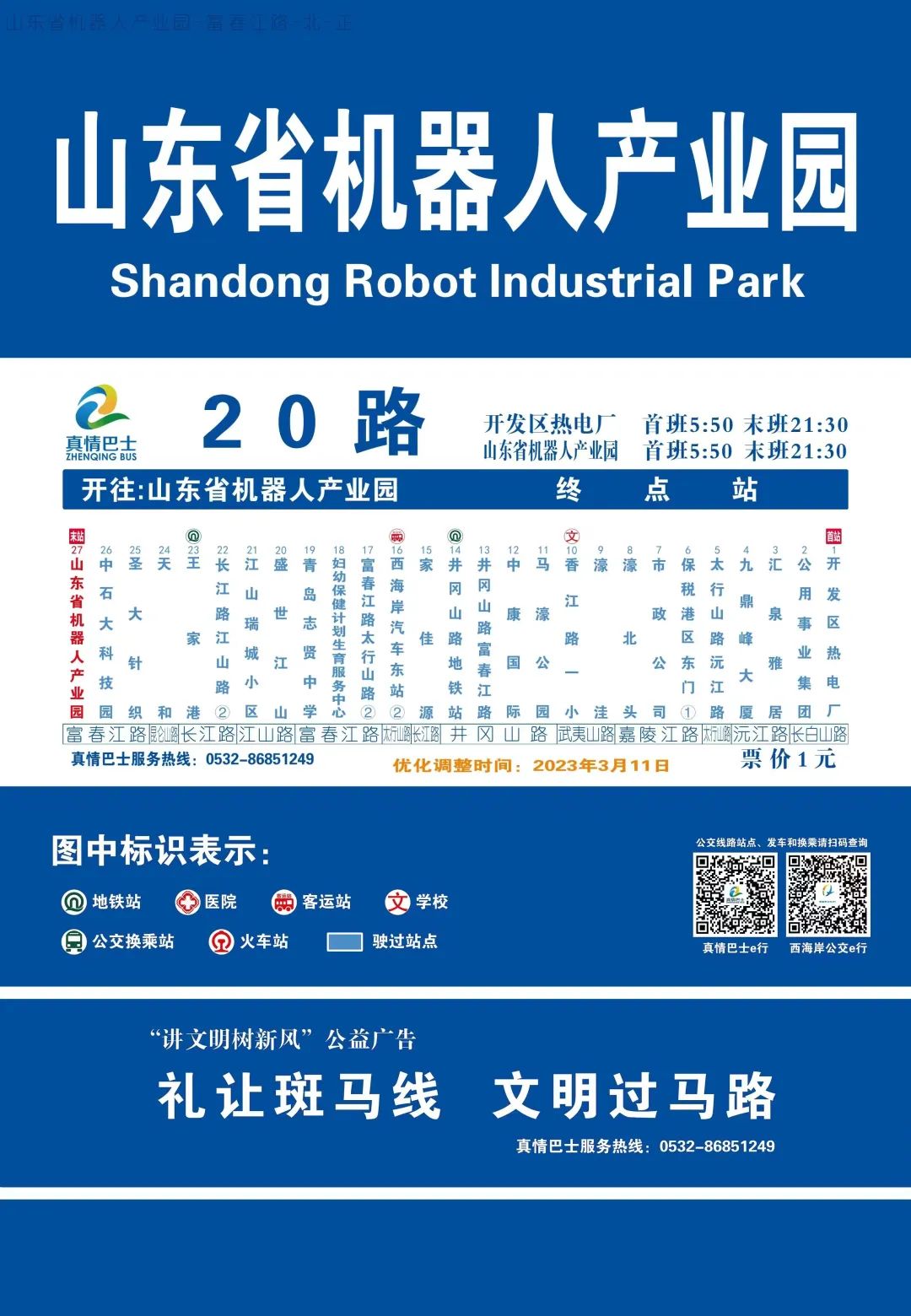2023年3月11日,山東省機(jī)器人產(chǎn)業(yè)園20路公交車正式通車。本條公交線路以山東省機(jī)器人產(chǎn)業(yè)園為首末車站,途徑昆侖山路、長江路、王家港及井岡山路地鐵站,方便園區(qū)企業(yè)員工實(shí)現(xiàn)地鐵、公交換乘出行。