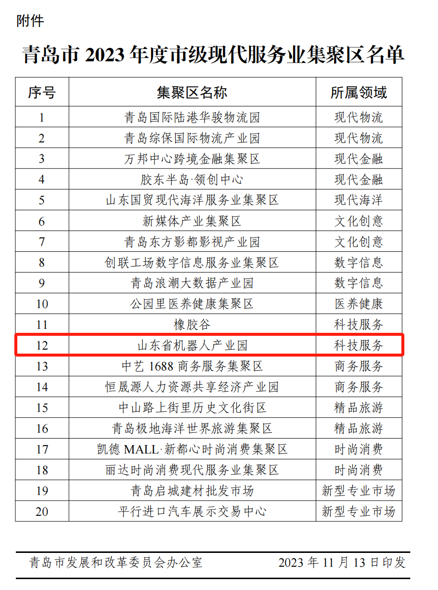根據《青島市市級現代服務業(yè)集聚區(qū)認定管理辦法》(青發(fā)改規(guī)〔2022〕4 號),市發(fā)展改革委組織開展了青島市 2023 年度市級現代服務業(yè)集聚區(qū)評選認定工作。經申報推薦、專家評審、現場核查、社會公示等環(huán)節(jié),山東省機器人產業(yè)園成功獲評“青島市2023 年度市級現代服務業(yè)集聚區(qū)”。受評定的集聚區(qū)將發(fā)揮示范引領帶動作用,推動未納統(tǒng)的集聚區(qū)管理機構及入駐企業(yè),實現青島市現代服務業(yè)集聚區(qū)數量、規(guī)模、質量、效益同步提升。