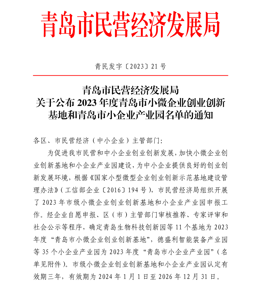 近日,青島市民營經濟發(fā)展局公布了《2023年度青島市小微企業(yè)創(chuàng)業(yè)創(chuàng)新基地和青島市小企業(yè)產業(yè)園名單》,山東省機器人產業(yè)園成功獲評為2023年度“青島市小企業(yè)產業(yè)園”。