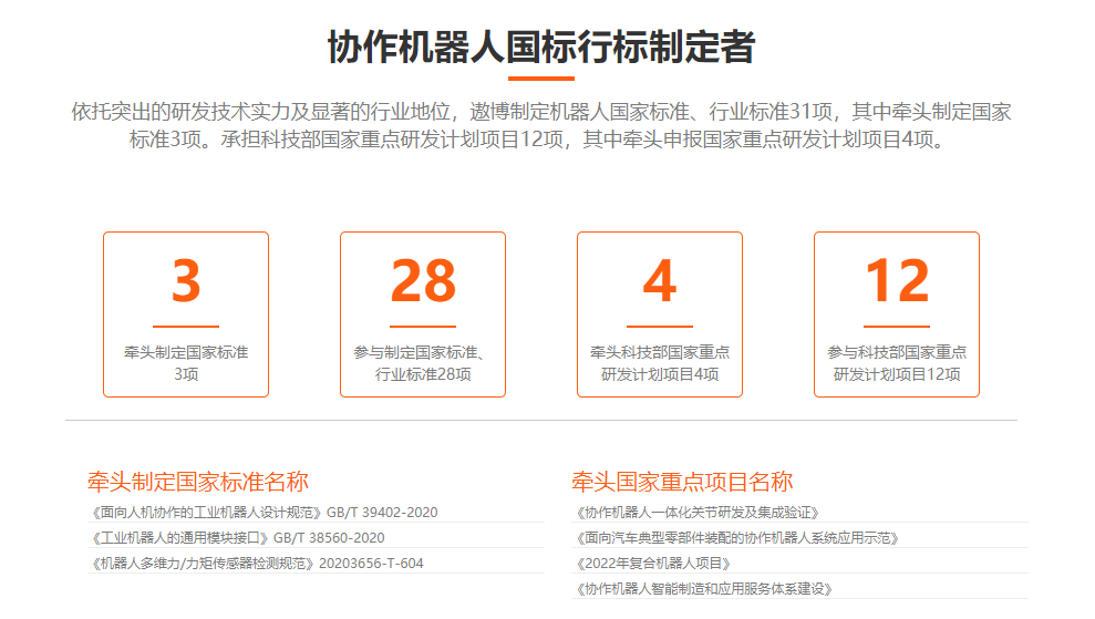陳龍?zhí)岬?,遨博智能是協(xié)作機(jī)器人國(guó)標(biāo)、行標(biāo)的制定者。遨博智能制定機(jī)器人國(guó)家標(biāo)準(zhǔn)、行業(yè)標(biāo)準(zhǔn)31項(xiàng),承擔(dān)科技部國(guó)家重點(diǎn)研發(fā)項(xiàng)目12項(xiàng)。